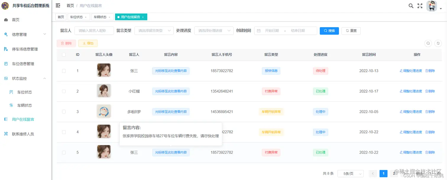 (6) 用户留言后,管理员可以在用户在线留言中查看留言内容和留言人信息,并可以调整留言处理进度。
