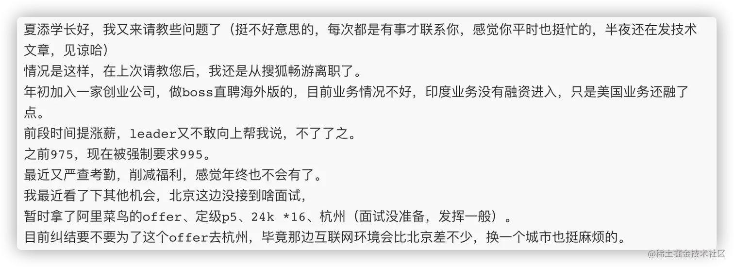 师弟说这次跳槽随便聊了下,也没怎么准备。我说,如果你真心要跳槽,就好好准备,该刷的题要刷,该卷的时候玩命卷,也许你能进入一个更好的平台呢。