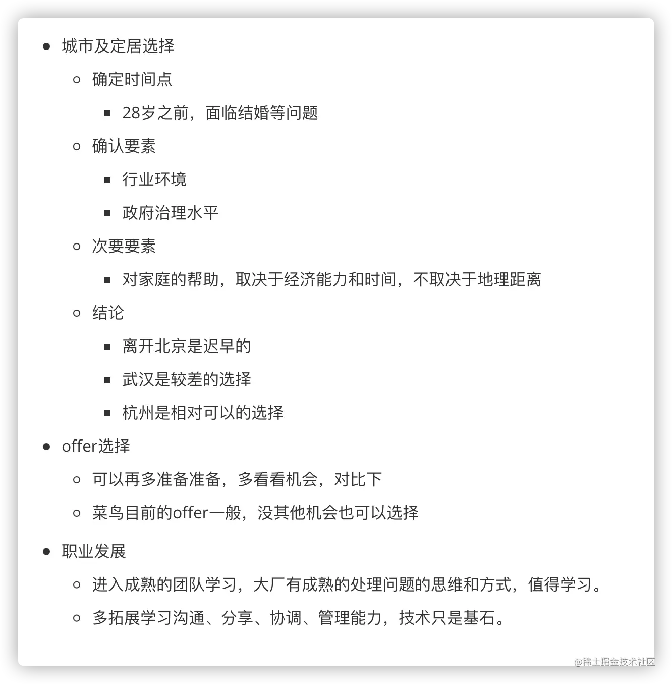- 前三年趁早去成熟的大平台,提升综合素养。