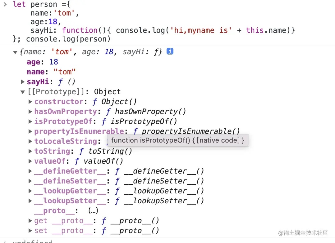 从控制台中输出的内容,可以看到除了创建的对象时定义的2个属性和1个方法,还多了一个[[Prototype]]。这是对象内部特性,主要用来描述属性的特征, 这些特性是由为 JavaScript 实现引擎的规范定义 ,一般无法直接访问。