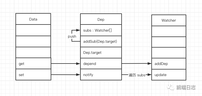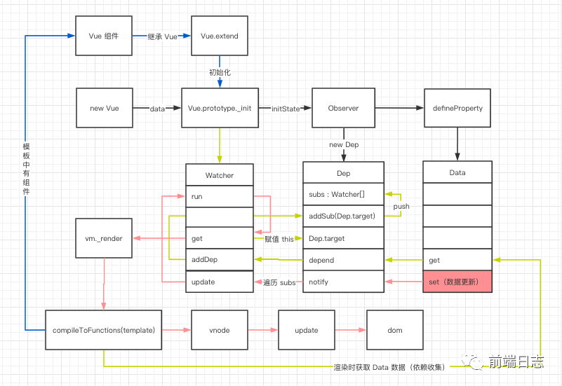 - 从 new Vue 开始,首先通过 get、set 监听 Data 中的数据变化,同时创建 Dep 用来搜集使用该 Data 的 Watcher。