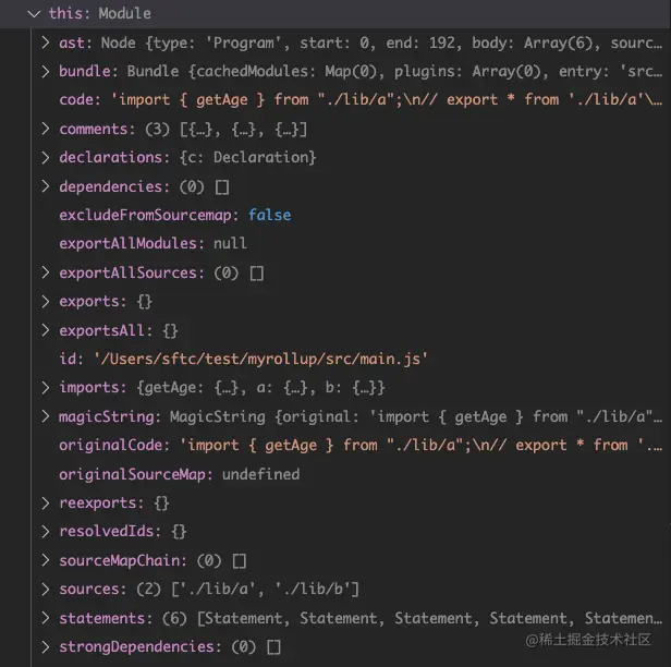 rollup对这个模块的代码进行了ast生成及基本的分析,记录了一些该模块的信息(这里就不一一展示了,后面用到的话再说明)