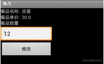 bmodify.setOnClickListener(new OnClickListener() {//设置修改按钮监听函数,设置当按钮被点击时修改食品的订购信息,并返回到购物车