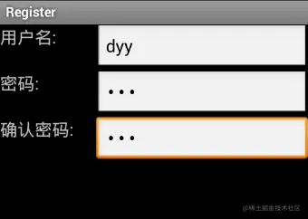 在public void onClick(View v);中测试用户名及密码是否为空,为空时给出提示,并判断两次输入的密码是否相同