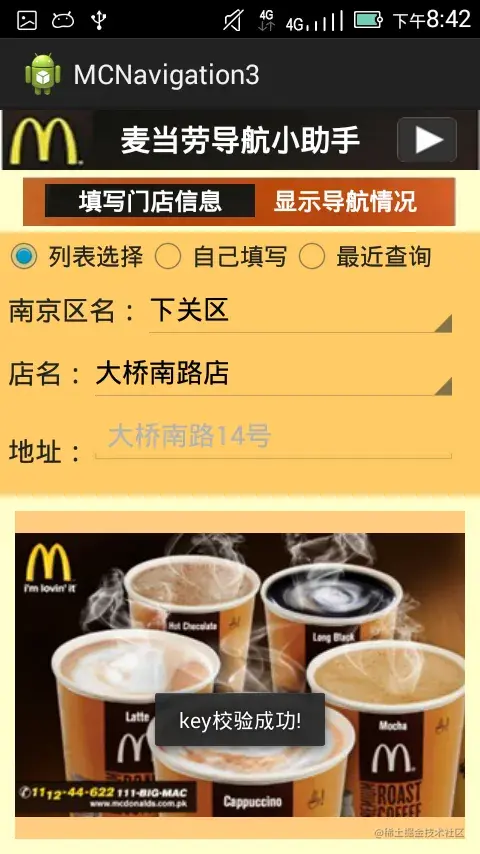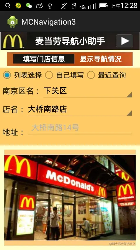 通过三种选择方式:列表选择、自己填写地址、根据距离最近查询来查询南京市各个麦当劳的地址,用百度地图即手机自带的GPS显示麦当劳位置,并依据路径语音导航。
