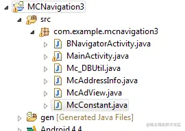 Mc_DBUtil:SQLite数据库的创建,注意数据库信息放入data/data/包名下面。正如sharedPerence中所提及的查看file Explore可以查看数据。对数据库的增删关闭操作。类中有初始化数据方法,通过sql语句获取城市名列表、获取区名列表、获取店名列表、获取确定了的店名列表、获取店名、所有地址的经纬度列表。