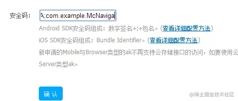 在之前的步骤中输入安全码,sha1值+我创建的应用的包名,点击确认如下图: