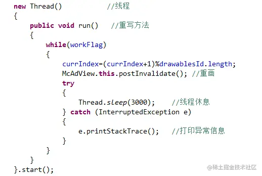 图片的动态显示即图片的重画,这段代码的作用是每隔3000ms重画一张图片,从而动态地显示图片起到做广告的作用。并依据图片的张数循环显示所有图片。