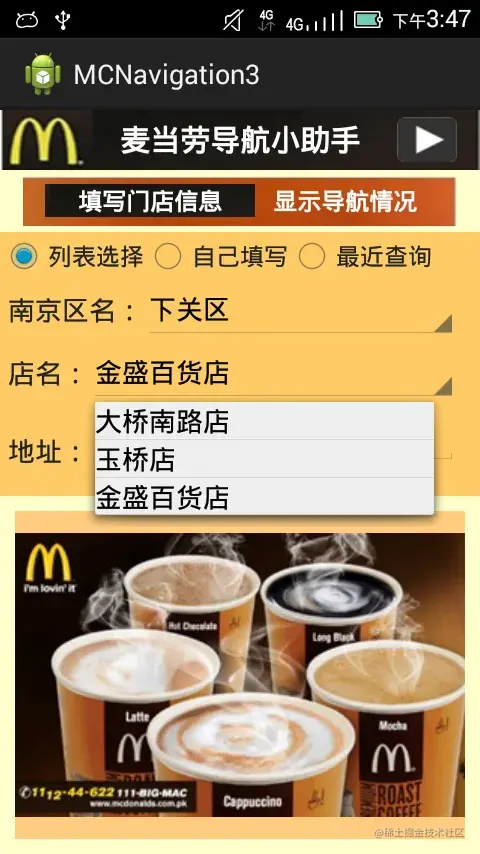 a.点开程序,选择列表选择按钮;选择相应的南京区名,再选择相应的店名,会自动填写地址。如图:
