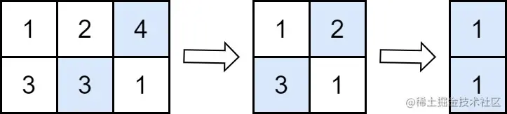 - 在第三步操作中,从第一行删除 1 ,从第二行删除 1 。在答案上加 1 。