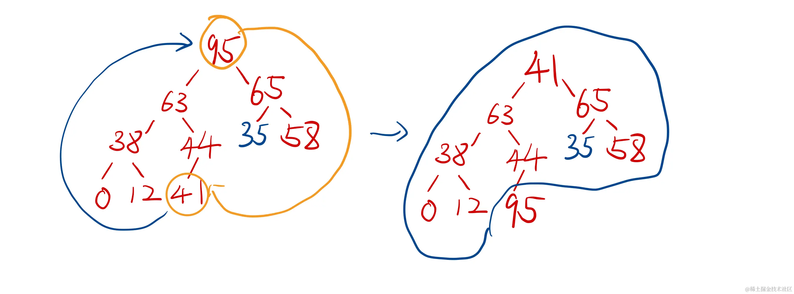 而在parent = 0的这一趟中,12有左右子树,左子树(95)大于右子树(58)大于12 [parent],此时交换95和12,循环继续并且(12)parent = 1,(63)lchild = 3。交换12和63,(12)parent = 3,(0)lchild = 7,(38)lchild++=8,右子树大于左子树大于根节点,交换12和38。本趟结束,根结点95为本数组的最大值。