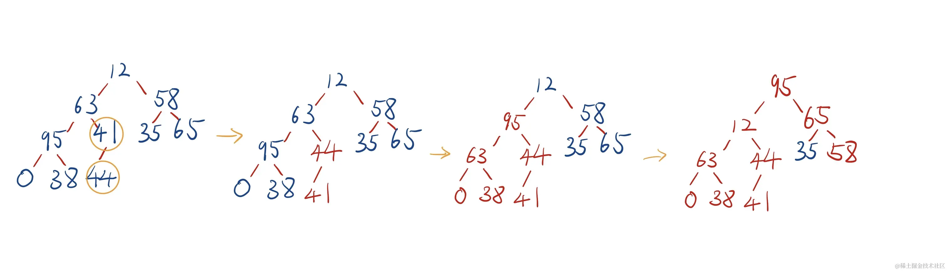 parent = 4,41没有右子树,44>41,因此交换了44和41,parent = 9,child值越界,循环结束。
