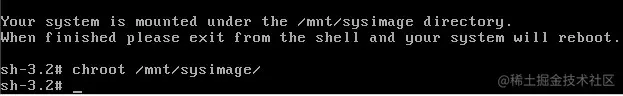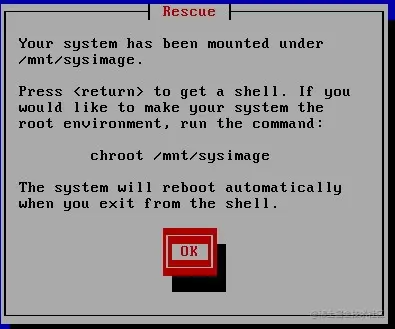 至此,系统已经挂载到了/mnt/sysimage中。接下来回车,输入chroot /mnt/sysimage 进入管理员环境。