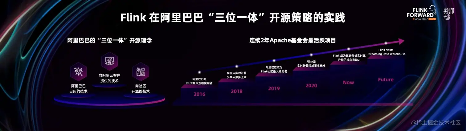 以 Flink 为例,2016 年阿里巴巴拿 Flink 作为实时计算中的一条路线,和其他自研的各种流计算相比较、迭代,最终基于 Flink 建设了一个叫做 Blink 的内部体系。之后阿里逐渐将这个体系贡献到社区中,并把它合并到 Flink 的主要分支里。