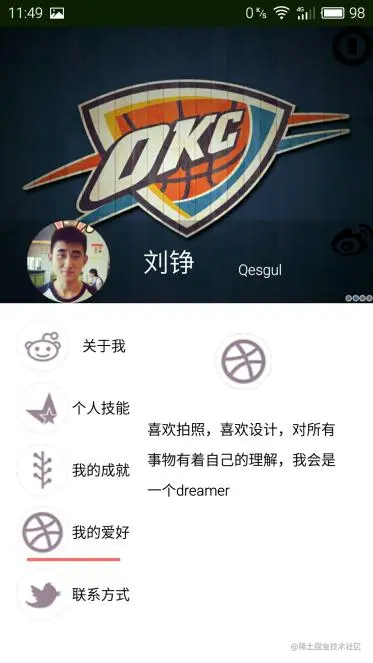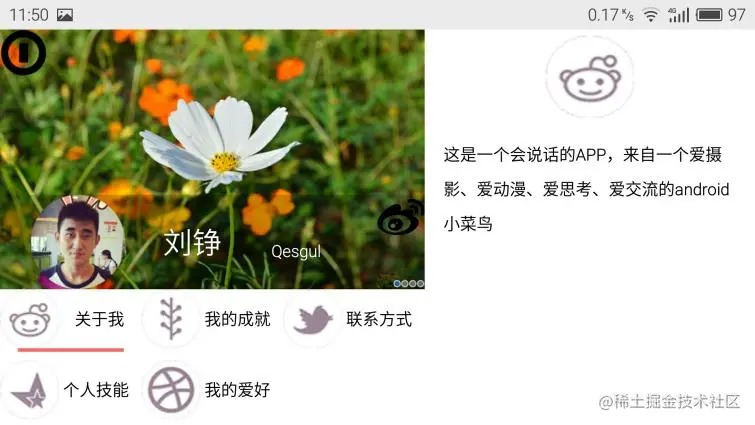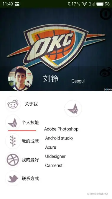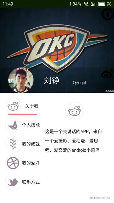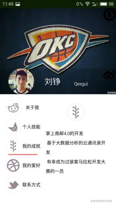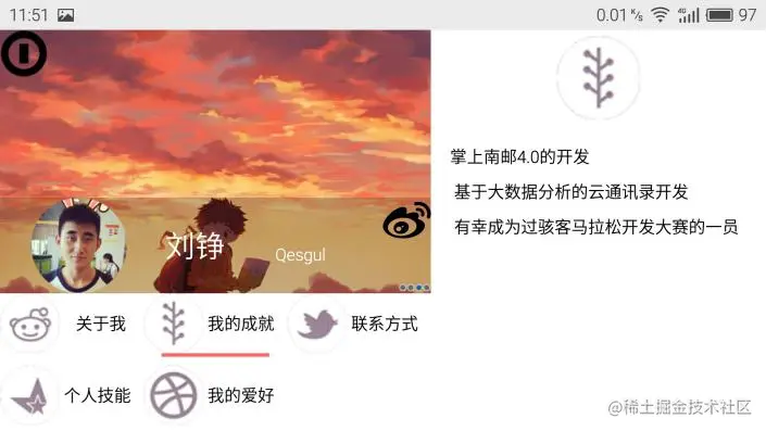 1.2 屏幕下方实现了关于个人文字介绍的方面,可通过点击左边的图片及文字查看不同的信息,在右方将不同的信息展示出来,其中包括左右方图片的统一切换,以及左方底部红线的提示功能使左方界面显得并不单调,考虑到安卓手机屏幕大小问题,使用了ScrollView防止左方显示变形,使界面更流畅化