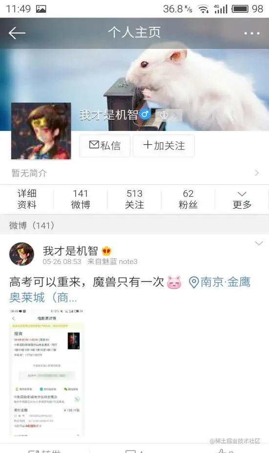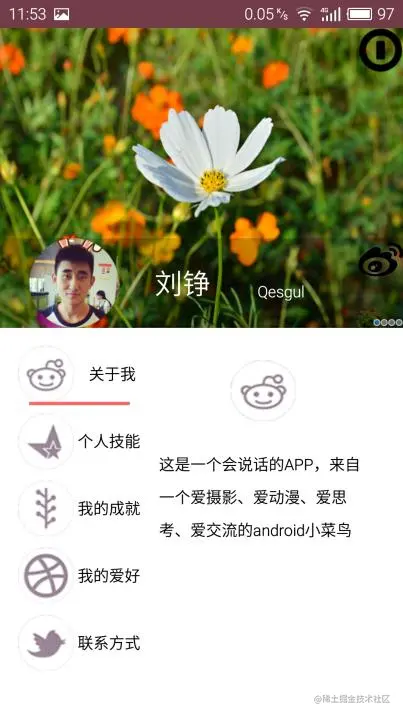 2、通过屏幕中间的微博标志,点击进入个人微博,通过Webview将个人微博展示,并可以通过登录来关注我的个人微博