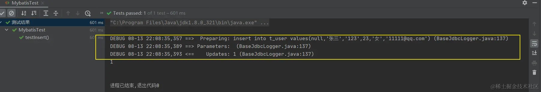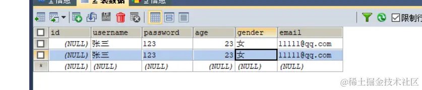 <insert id="insertUser"> insert into t_user values(null,'张三','123',23,'女','11111@qq.com') </insert>