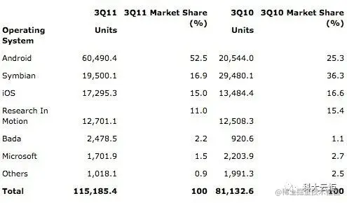 据Gartner最新数据显示,2011年第二、三季度全球智能手机销售继续大幅增长,其中第三季度Android 的市场份额突破了 50%,达到了 52.5%,超过了 iOS 和 BlackBerry 系统,成为全球第一大智能手机系统。2011第二、三季度与去年同期相比,增度分别是15.4%及22%,增势迅猛。而塞班系统市场份额还是有 16.9%,但比起去年同期已经是跌去一半,形势非常严峻。iOS 的份额则略微有所下滑,从去年同期的 16.6% 跌到了 15%。BlackBerry OS 系统则有所下滑,而 Bada 份额则到了 2.2%。