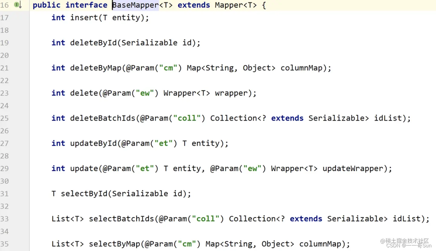 我们这里的接口中,不必编写任何CRUD方法,只需要继承BaseMapper接口即可。通过阅读源码我们可以发现,在这个接口中其实已经封装了常见的CURD方法,源码如下: