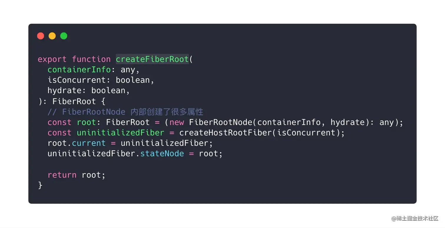 对于 FiberRoot 对象来说,我们现在只需要了解两个属性,分别是 containerInfo 及 current。前者代表着容器信息,也就是我们的 document.querySelector('#root');后者指向 RootFiber。