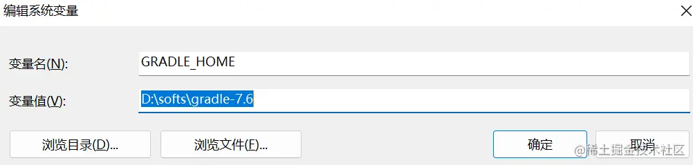 添加系统变量:GRADLE_HOME=D:\softs\gradle-7.6