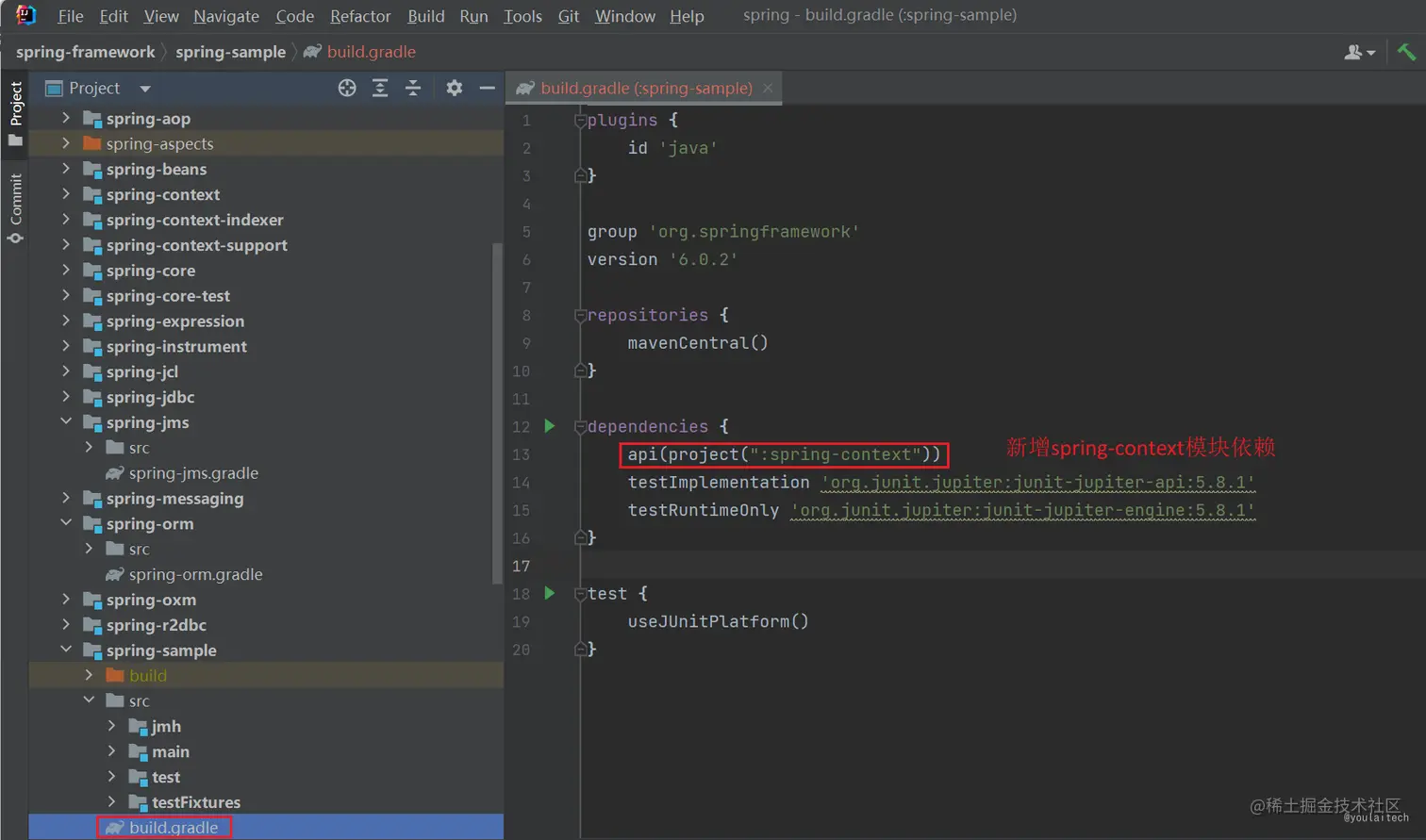 在 spring-sample 模块下的 build.gradle 新增 spring-context 依赖,它是包含了 spring-core、 spring-bean 和 IoC容器等Spring 运行时上下文的依赖。