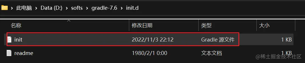 在gradle安装位置(D:\softs\gradle-7.6\init.d) 目录下新建 init.gradle 文件