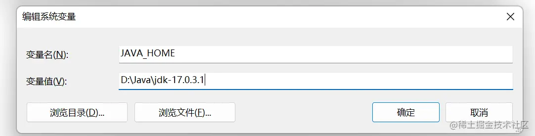 添加系统变量 JAVA_HOME = D:\Java\jdk-17.0.3.1
