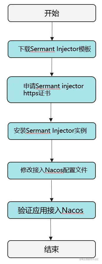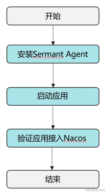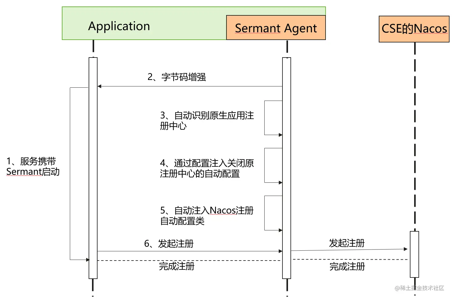 Sermant Agent正是基于动态修改字节码的技术,在服务启动时,动态增强原服务的注册逻辑。那Sermant Agent是如何在不修改代码的前提下接入Nacos呢?主要流程如下:
