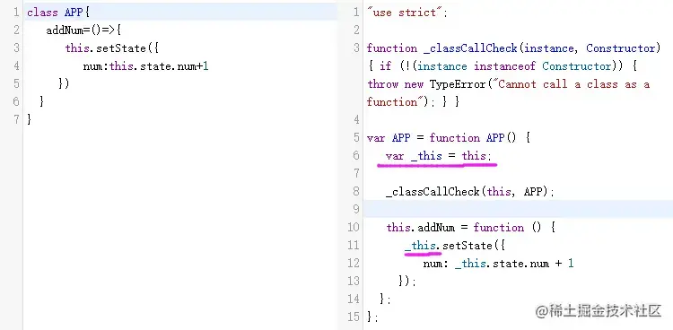 这里有一个小tips,我感觉大家很容易犯错的地方,有关箭头函数的this指向问题,大家看下图。箭头函数转化成ES5的话,我们就可以很清晰得看到,箭头函数指向他上一层的函数对象。这里也就指向App这个对象。