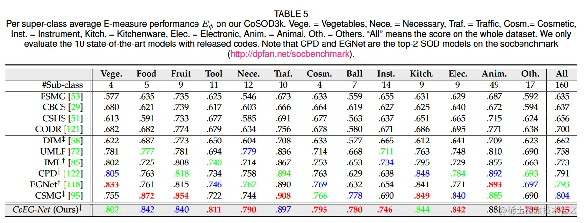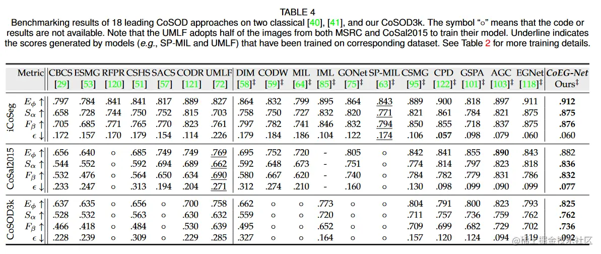 - SOD方法的良好表现并不一定意味着当前的数据集不够复杂,或者直接使用SOD方法可以获得良好的性能:From the evaluation, we observe that, in most cases, the current SOD methods can obtain very competitive or even better performances than the CoSOD methods. However, this does not necessarily mean that the current datasets are not complex enough or using the SOD methods directly can obtain the good performances—the performances of the SOD methods on the CoSOD datasets are actually lower than those on the SOD datasets.