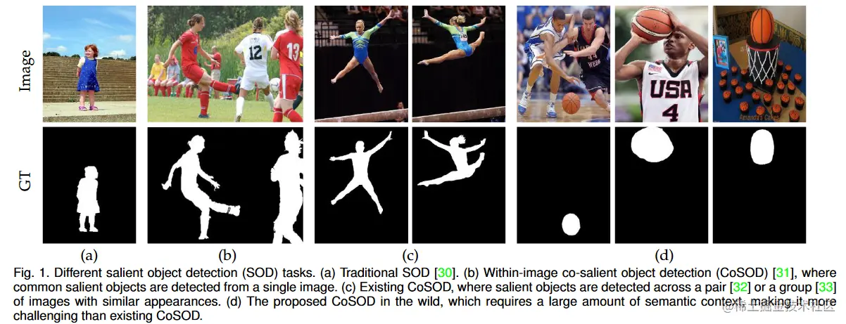 The goal of CoSOD is to extract the salient object(s) that are common within a single image (e.g., red-clothed football players in Fig. 1 (b)) or across multiple images (e.g., the blue-clothed gymnast in Fig. 1 (c)).