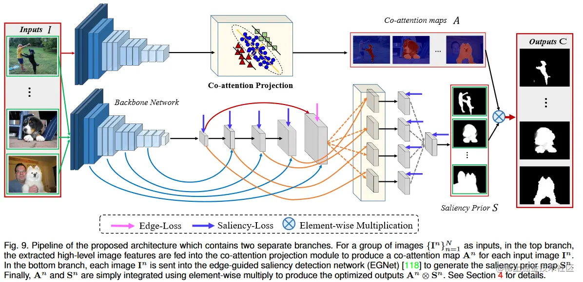 本文提出了一个两分支的框架以一种多重独立的方式(in a multiply independent fashion)分别捕获并发依赖(concurrent dependencies)和显著性前景。通过上面的分支获得co-attention maps和下面分支获得的saliency prior maps之间相乘(element-wise)来产生最终的co-saliency prediction.