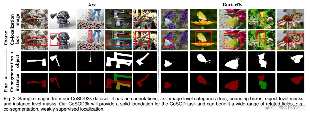 - 提出了CoSOD3k数据,包含13个超类,160组,3316张图,提供了多个级别的标注信息,即类别,边界框,对象和实例。