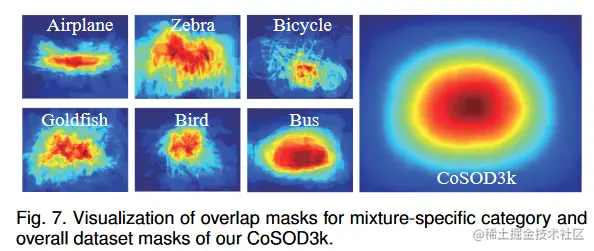 The overall dataset mask (the right of Fig. 7) tends to appear as a center-biased map without shape bias . As is well-known, humans are usually inclined to pay more attention to the center of a scene when taking a photo. Thus, it is easy for a SOD model to achieve a high score when employing a Gaussian function in its algorithm. Due to the limitation of space, we present all 160 mixture-specific category masks in the supplementary materials.
