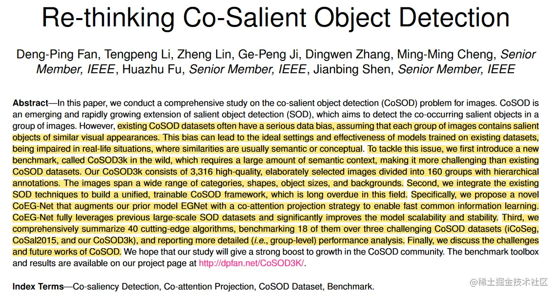 这是一篇CoSOD综述,阐述了什么是CoSOD,发现了现存数据集的缺陷,并公开了一个新的数据集CoSOD3k,提出了一个统一的、可训练的框架CoEG-Net,并总结了40个前沿算法,在4个数据集对其中的18个进行了基准测试,提供了一个基准工具箱,集成了各种公开可用数据集和多个评价指标,讨论了CoSOD面临的挑战和未来工作。