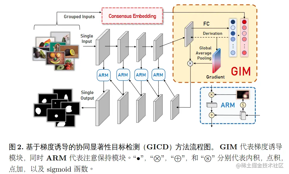 - 提出了一个基于梯度诱导的协同显著性目标检测(GICD) 网络。具体地,提出了一个梯度诱导模块(GIM)使得模型在训练过程中更加注意对协同显著目标更具有鉴别性的特征。同时提出了一个注意保持模块(ARM)来保持自上而下解码的过程中的注意力。