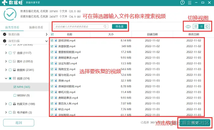 步骤2: 第一次快速扫描结束,你就可以在页面左侧来查看视频文件类型了。左侧有两种选择:按类型查看、按路径查看,选择其中一种。建议【按类型查看】,会更直观,也符合我们的日常阅读习惯。