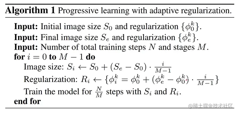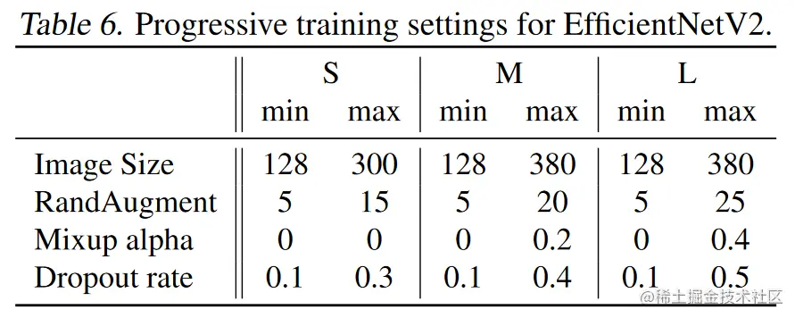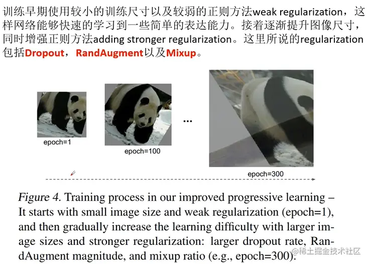 - 引入渐进式学习策略(训练更快)(该方法会根据输入图像尺寸动态调节正则方法:Dropout、Rand Augment、Mixup)