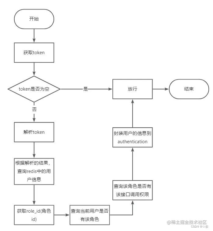 首先,进入自定义的过滤器中,获取客户端传的token,如果token为空,则进入下一层跳出该过滤器,进入配置中,查询是否为不需要权限认证的接口,不是则抛出异常(认证失败);如果token不为空,则使用jwt解析token,获取其中的userId,根据该userId查询redis中存储的用户信息,查询为空则抛出异常(账户过期,请重新登录),之后获取客户端传的role_id(角色id,因为一个用户可能有多个角色,因此需要传个角色id,告诉服务器当前角色),将客户端传的role_id和之前在redis中查询的用户信息比对,查看是否存在该角色,存在,则通过该role_id查询redis中该角色的权限,判断当前请求路径该角色是否拥有权限,有权限则将权限信息封装到authentication中,放行。