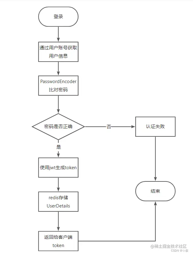 首先,系统会将输入的用户名和密码放入authentication中,之后进入UserDetailsService的实现类中,调用sql,通过用户名查询账号信息和角色信息,统一存储在UserDetails中,之后PasswordEncoder会将查询到的账号密码和authentication中密码进行比对,密码不一致,则抛出异常(认证失败),密码正确则开始执行登录的业务,使用jwt生成token,将UserDetails存储到redis中,然后将token和角色id集返回给客户端。