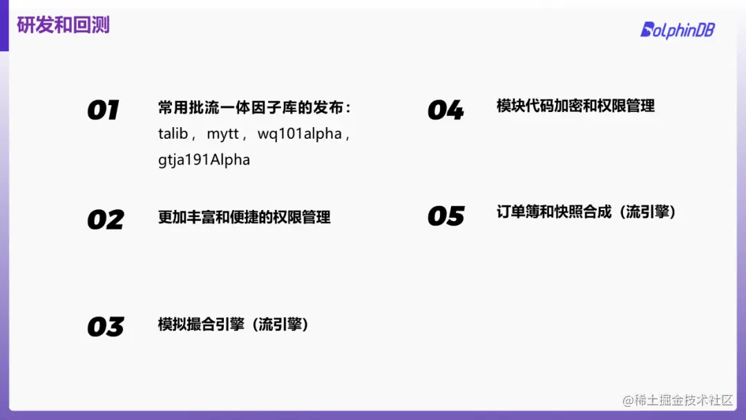 DolphinDB目前已经实现了诸多研发成果,未来也将在行情接入、研发回测、生产交易和基础设施等方面进一步发展。