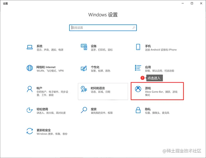 **第1步:**使用快捷键“win+i”,打开window设置界面,在设置界面中找到并点击“游戏”选项。也可以通过左下角“开始菜单栏”,点击齿轮状的“设置”进入windows设置界面。