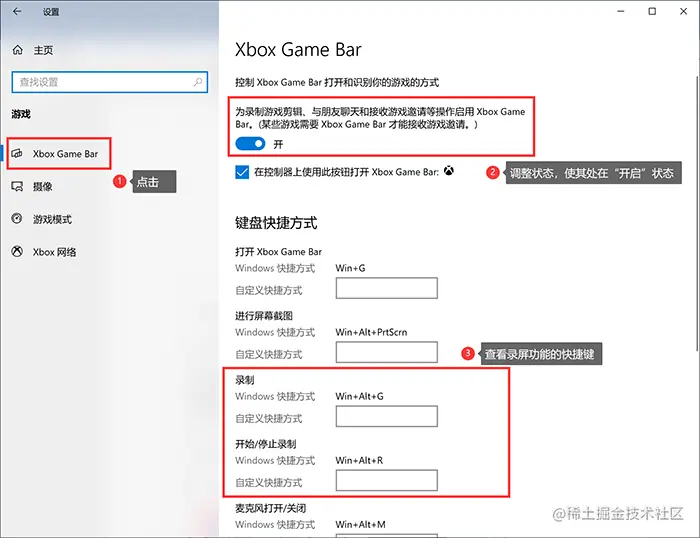 **第2步:**点击左侧选项栏中的“Xbox Game Bar”,在右侧的具体设置中,将“Xbox Game Bar”开启,并查看下方录屏功能的快捷键。可以通过“win+alt+g”打开录制功能,也可以通过“win+alt+r”开始或停止录制。