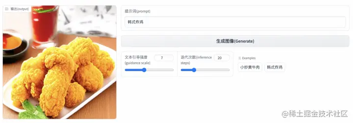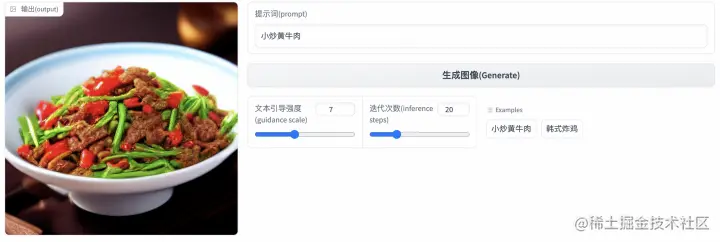 为了方便开源社区用户的体验,我们在HuggingFace Space上展示了多个PAI-Diffusion模型的文图生成应用。以世界美食为例(huggingface.co/spaces/alib…),用户只需要输入或者选择菜品名称作为输入,就可以得到模型生成的高清大图,示例参见下图。