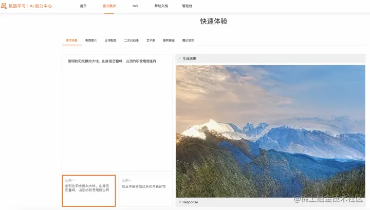 阿里云机器学习AI能力中心提供了场景多样的AI实操案例,包括图像智能、自然语言处理、视频智能、多模态等各个领域的案例。我们也上架了PAI-Diffusion模型文图生成的功能,提供了更多不同场景下模型生成的高清大图。用户可以在这里体验AI能力中心的文图生成功能,示例参见下图。