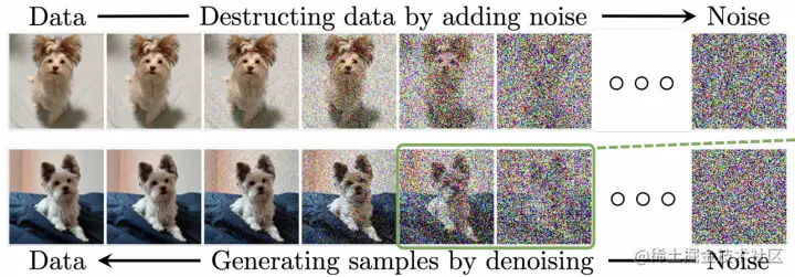 扩散模型有两个过程,分别为扩散过程和逆扩散过程。如下图,扩散过程为从左到右的过程,表示对图片逐步增加噪声。逆扩散过程为从右到左的过程,表示从高斯噪声中逐步去噪,复原出原图。