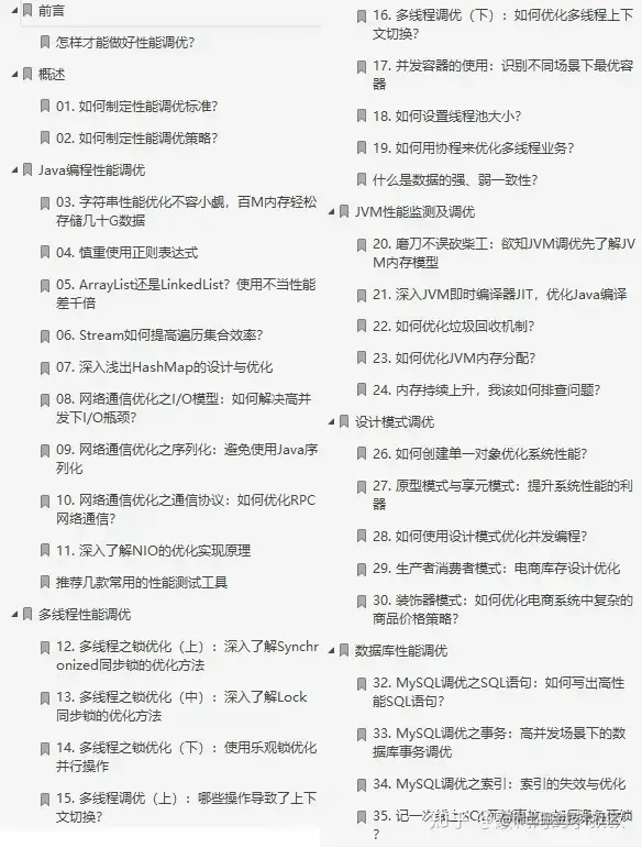 Java 性能调优包含:Java编程调优、多线程调优、JVM调优、设计模式调优、数据库性能调优,每个层级都会遇到不同的问题。这份笔记带你从实战出发,精选高频性能问题,透过Java 底层源码,提炼出优化思路和实现原理,形成一套学完即用的调优方法论。