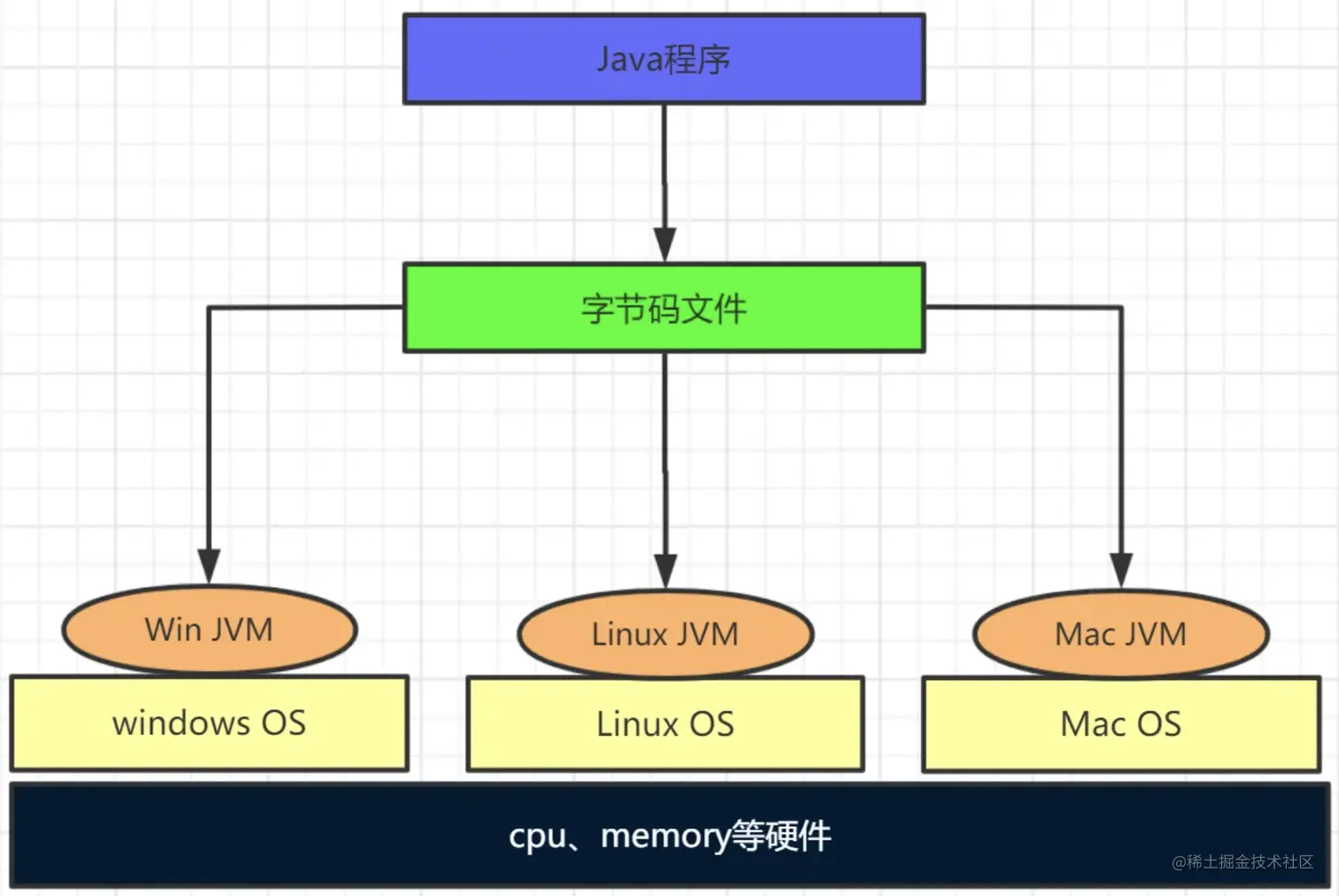 Java之所以可以实现跨平台,最根本的原因是由于JVM虚拟机的存在! 我们先来看下图: