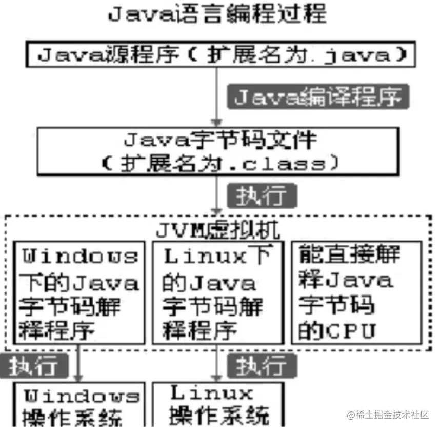 JVM最核心的一个模块叫Java解释器,相当于是计算机的“CPU”,可以将.class字节码解释成适合不同操作系统的可执行代码。Java解释器实际上就是特定系统平台下的一个应用程序,只要实现了这个解释器程序,Java字节码就能通过该解释器在该平台下运行,这是Java之所以可以实现跨平台的根本原因所在!